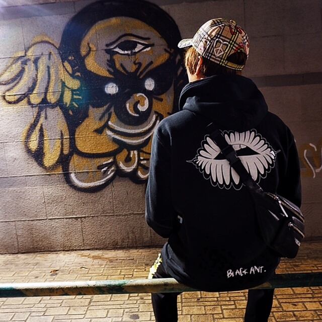 前がハッシュタグで後ろには唇のロゴとBLACK ANTと記入されており目立って可愛いデザインです。